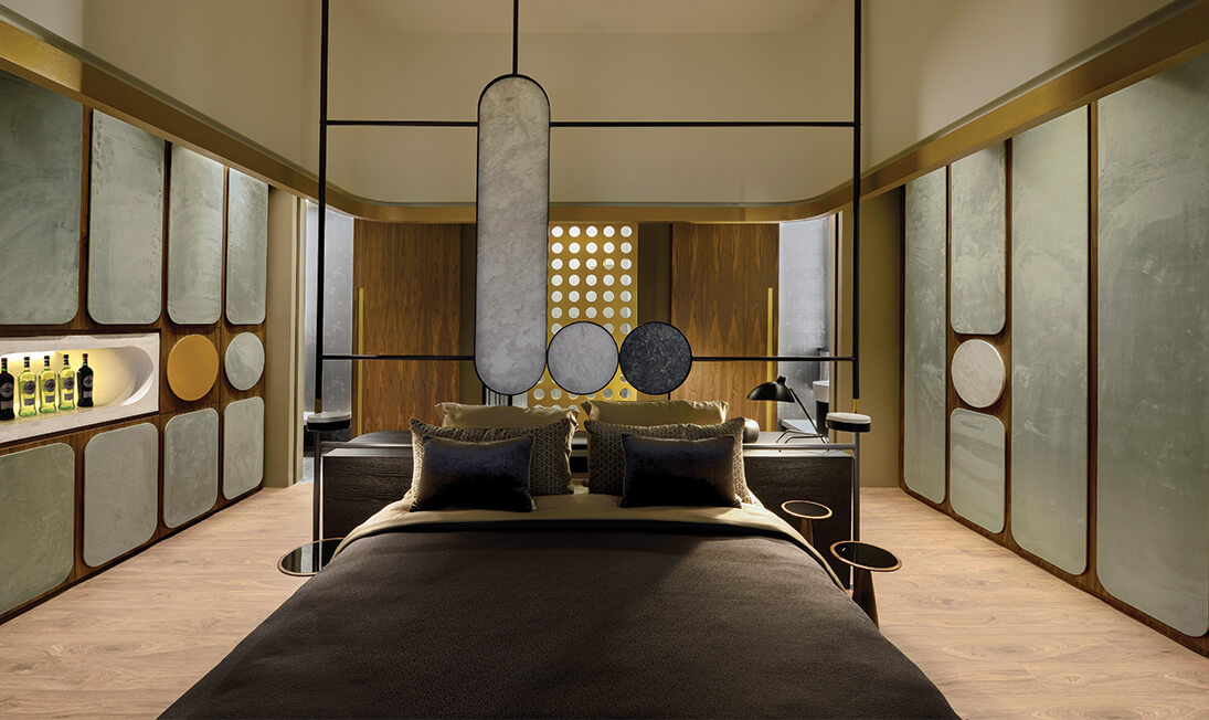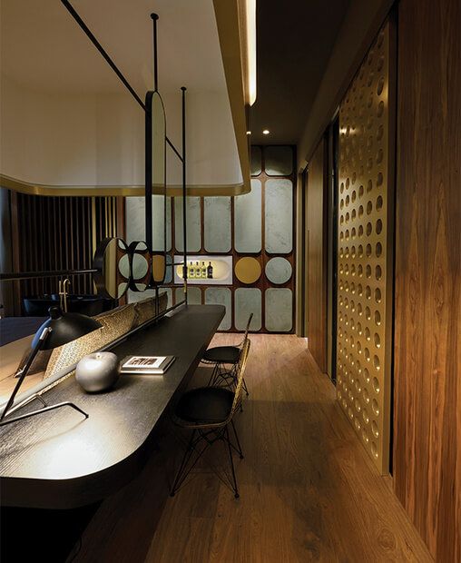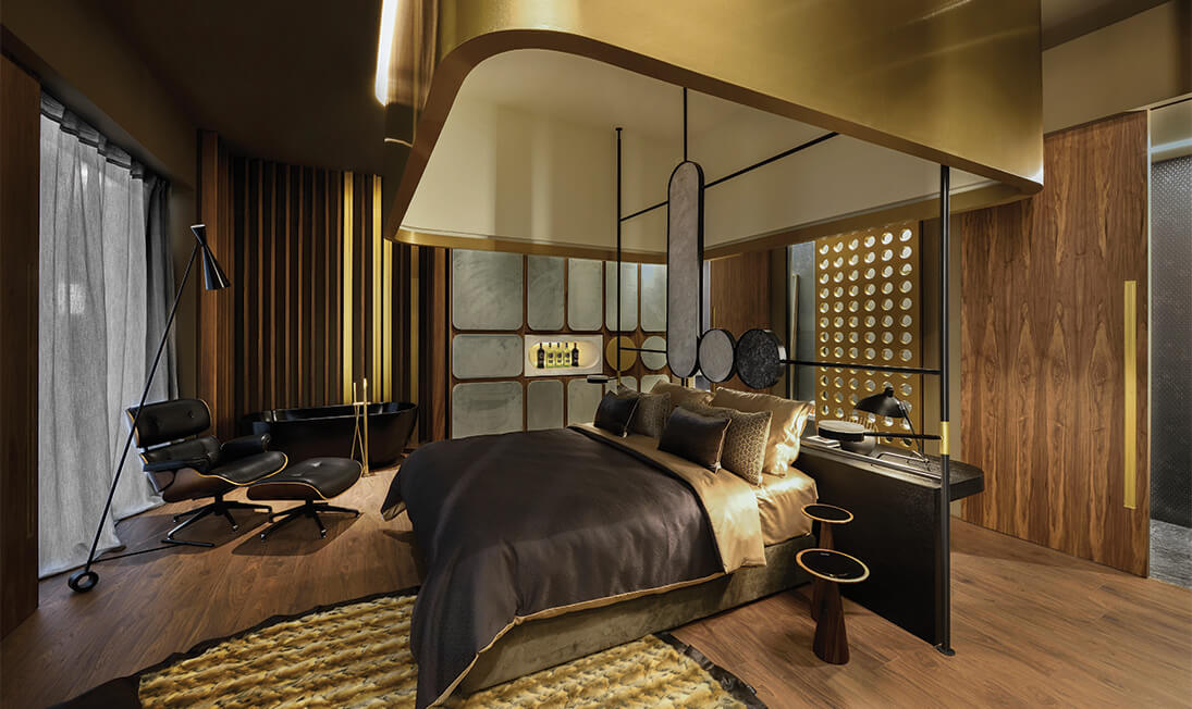The basic idea has been based on the aesthetics of the James Bond movies. Consequently, the concept was determined by a sense of mystery, luxury, seduction, as well as by the use of hotel automation and the latest technological tricks. Moreover, a principal goal of this endeavor has been the introduction of new technologies, such as automations regarding the lighting and signage of hotel rooms. The composition of the floor plan of the suite is pretty unconventional, due to the fact that the separation of sub-spaces doesn’t follow the traditional rules.