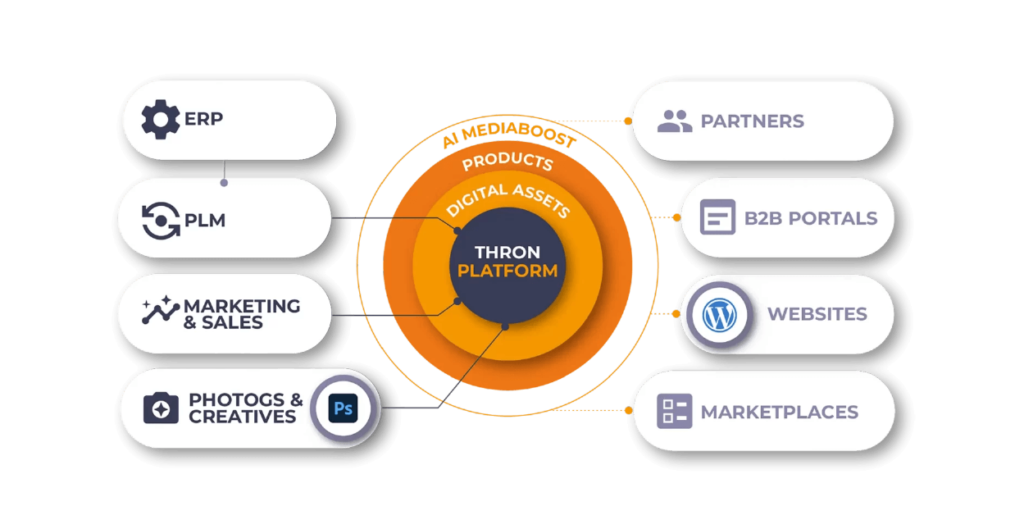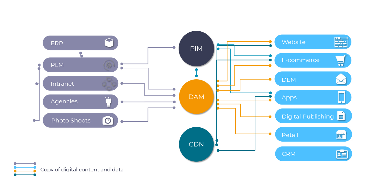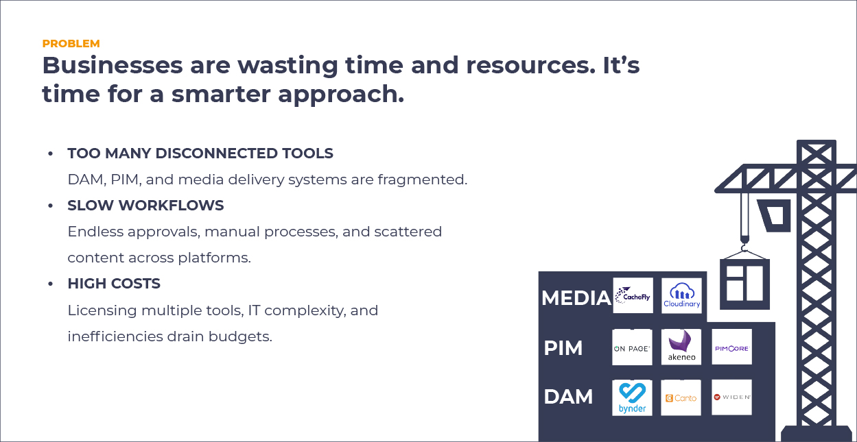 Systems like DAM, PIM, and content distribution platforms operate side by side – but not together.